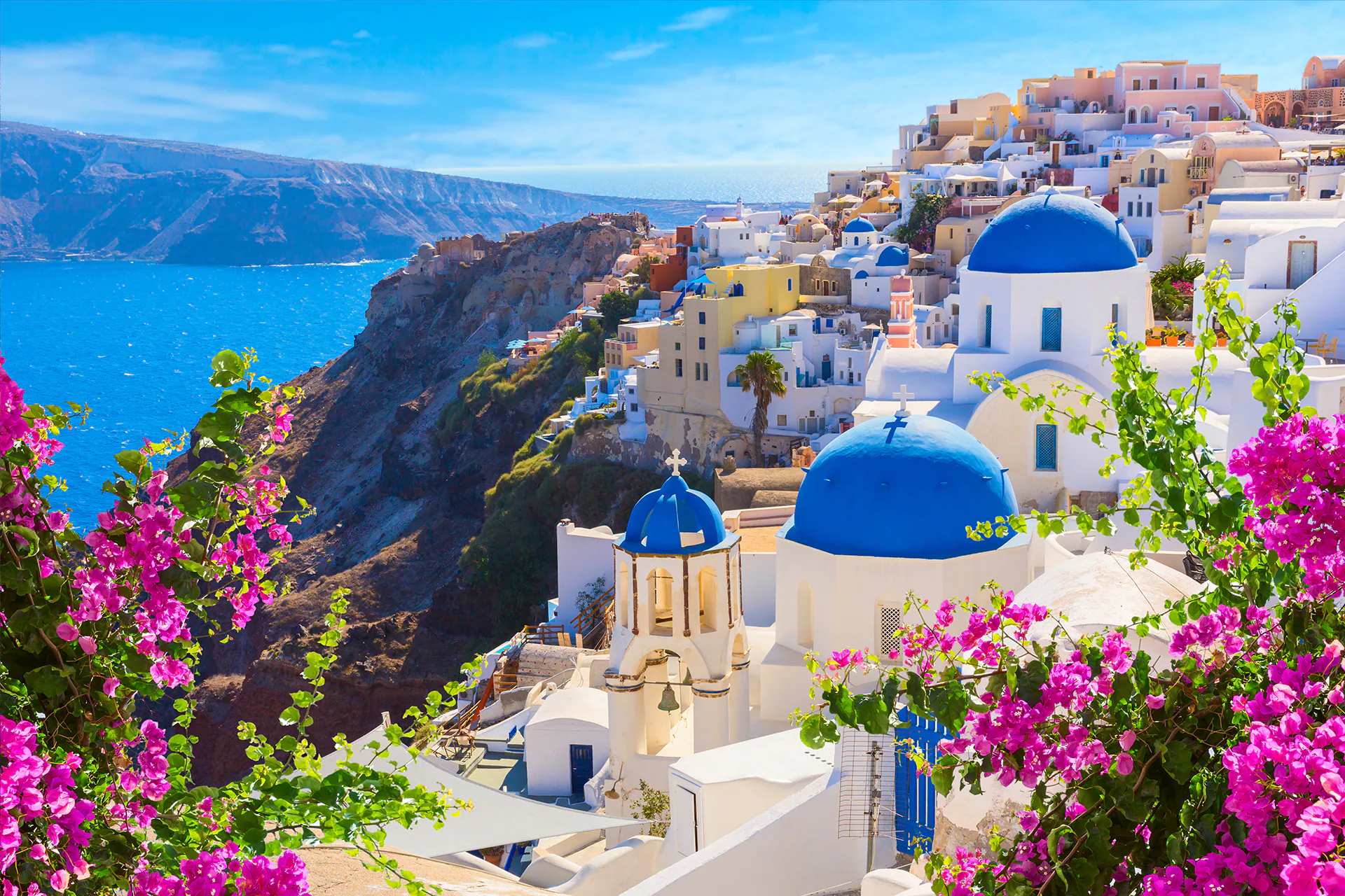 O impacto é imediato: casas brancas suspensas sobre o mar azul e o pôr do sol que faz o mundo inteiro suspirar.